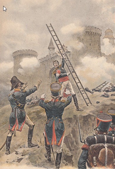 A la nuit tombée, le Maréchal Lannes qui décédera un mois plus tard, remarqua une brèche dans les défenses qui n'avait pas été réparée. Il s'empara alors d'une échelle pour franchir les remparts et dit à ses troupes pour les galvaniser: