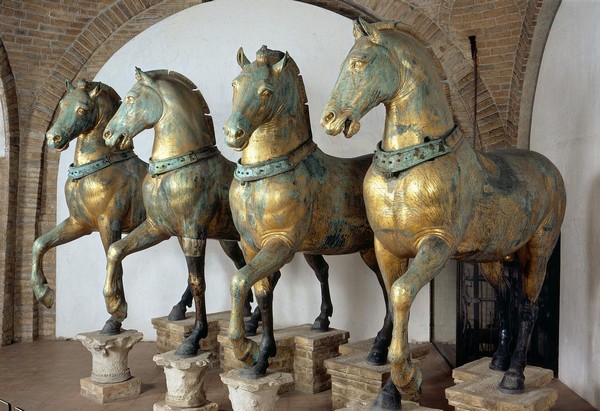 Le fameux quadrige de Venise est constitué de 4 chevaux en cuivre coulé vraisemblablement du IIe siècle et d'origine grec. Chaque cheval pèse 900 kg et est haut de 2,33 m et long de 2,53 m. Ils furent transportés à Venise en 1204, lors du sac de Constantinople par les croisés à la demande du Doge Dandolo pour rembourser leur dette relatif au transport en terre sainte fourni par les Vénitiens. Ils ornaient alors l'hippodrome de Byzance.