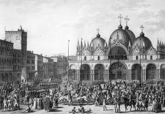 Par le Traité de Campoformio (17 octobre 1797), Bonaparte s'empare de Venise au détriment de l'Autriche. Avant d'évacuer Venise, le général pille la cité en volant plusieurs toiles de maîtres et des centaines de manuscrits grecs et latins. Ses soldats procèdent aussi à l'enlèvement des chevaux de Saint-Marc sur le fronton de la basilique pour les faire transporter à Paris.