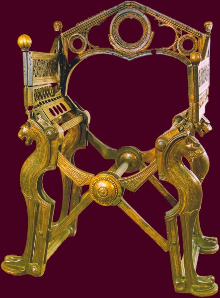 Le Trône dit de Dagobert, en bronze, est mentionné pour la première fois par Suger, le célèbre abbé de Saint-Denis qui entreprend de reconstruire l'abbaye vers 1130.