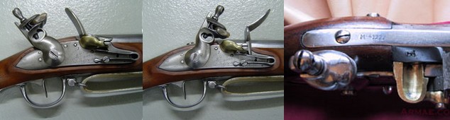Le principe de mise à feu était précaire et il était courant d'avoir des ratés surtout si l'humidité s'en mêlait...On vissait sur le chien du fusil un silex qui va produire l'étincelle qui mettra le feu à la poudre en venant frapper la platine mobile qui, une fois déplacée par l'impact, libère le bassinet extérieur rempli de poudre qui s'enflamme alors (du moins on l'espère). Ce bassinet communique avec la culasse du canon par une petite lumière (petit orifice pratiqué dans le canon). Le feu est communiqué à la poudre présente dans la culasse du canon qui provoque la détonation et la propulsion de la balle hors du canon. Ne disposant pas de canon rayé (sauf pour la carabine Baker dont étaient dotés les Riflemen anglais à Waterloo), la précision du tir est médiocre et le feu doit se faire à courte distance de l'ennemi.