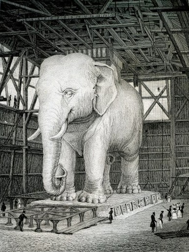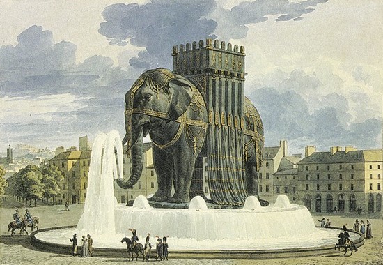 Mais les fontaines sont aussi destinées à magnifier la gloire du régime tout en embellissant Paris. Arrêtons-nous un instant dès lors sur l'énorme fontaine de la Bastille. Comme son nom d’indique, l’éléphant de la Bastille était destiné à orner la place du même nom. La fontaine devait être alimentée par l'eau de l'Ourcq acheminée par le canal Saint-Martin et être surmontée d’une statue colossale d'un éléphant portant un howdah(*) en forme de tour. Le projet fut décidé après 1812, mais jamais réalisé suite à la chute de Napoléon pour finalement être définitivement abandonné après la Révolution de 1830 au profit de la colonne de Juillet.